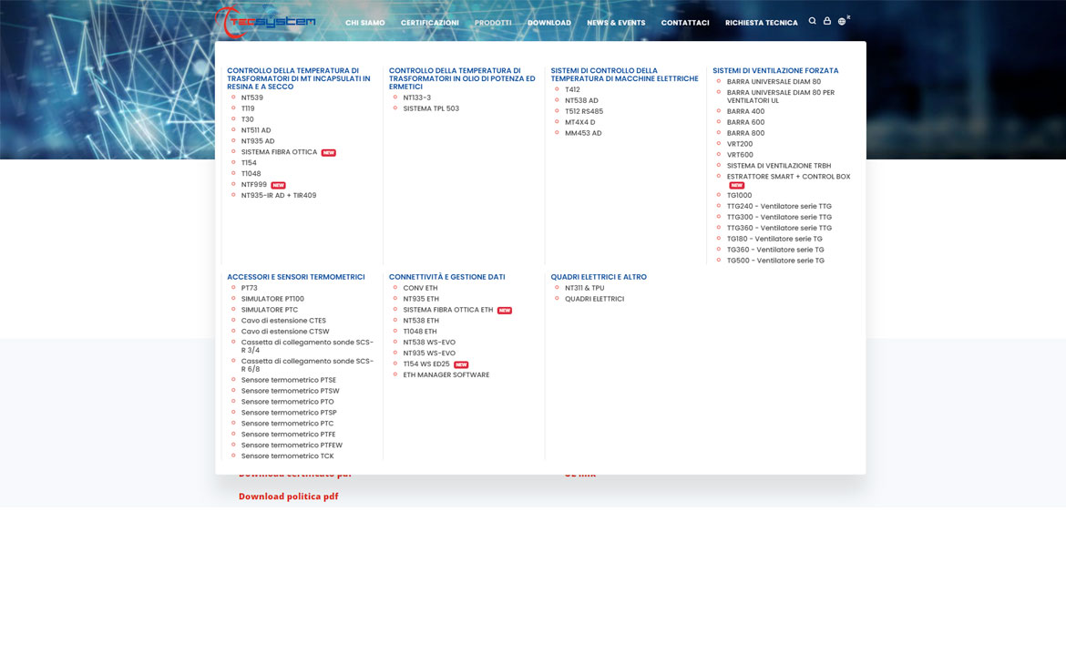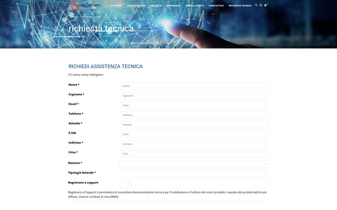 La vera innovazione del sito Tecsystem è nell'applicazione backend: un sistema proprietario di gestione che funziona come un CRM customizzato sulle specificità del settore. I clienti Tecsystem accedono a un'area riservata dove possono aprire e monitorare tre tipologie di richieste: assistenza tecnica su dispositivi installati, richieste di modifica per adattamenti specifici e richieste tecniche per nuove configurazioni.
