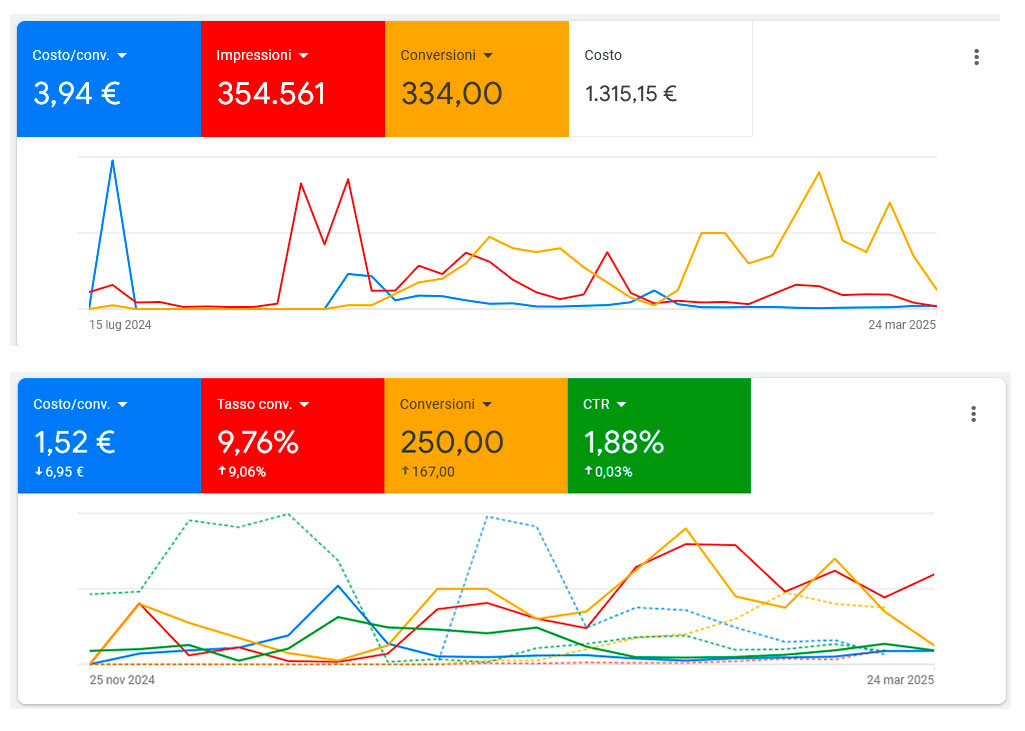 La campagna adwords da luglio 2024 a marzo 2025 ha generato 334 conversioni.